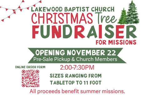 Our Annual Christmas Tree Fundraiser for Missions begins on November 22nd for pre-sale purchases & church members. Our lot will open to the public the following day on November 23rd.
