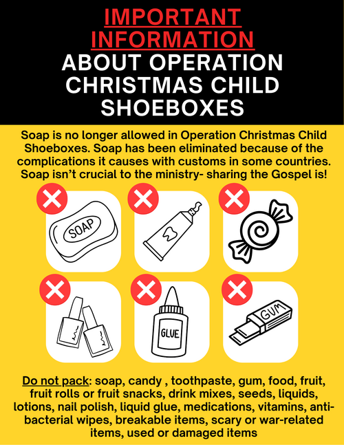 Each year, our children's ministry collects items and donations to pack shoe boxes. Our children packed over 700 shoeboxes last year!